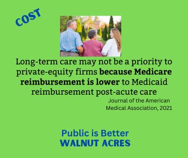 “On the topic of “If you collect the money that you bill, and you are a County Owned Not-for-Profit Nursing Home you can’t lose. There’s a report that goes out every year, called a cost report that goes to Medicaid (State). It’s all your expenses and all your income for the nursing home. The way that the State determines the Medicaid rate for your County Nursing Home is they take that report and they take your expenses and they divide by the number of patient days you have and that’s your new rate. So they are saying you are going to break even, you can’t lose money. We are giving you credit for every dime you spend. But, they won’t give you credit for money you haven’t collected. That’s on us, on you, and everyone here. That’s on the County and the Nursing Home.